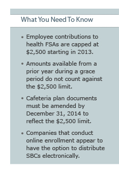 If your company offers health flexible spending arrangements (FSAs), your 2013 open enrollment materials should note the new $2,500 cap on employee contributions. The ACA places a $2,500 limit (indexed for inflation) on employee contributions to a health FSA starting in 2013. IRS Notice 2012‑40 (released May 30, 2012) provides the following details: