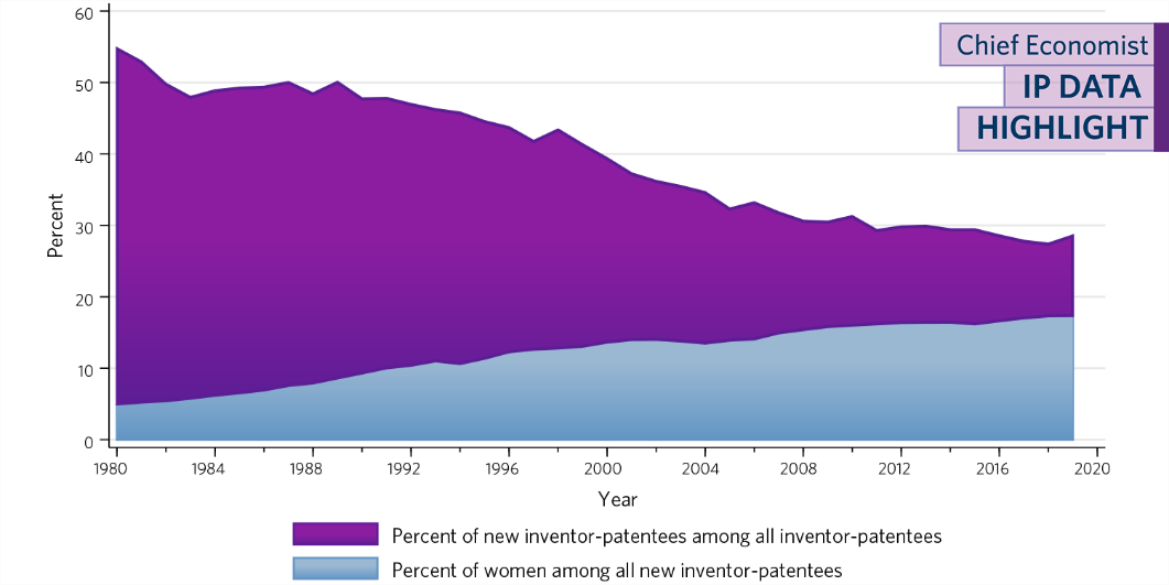 - the number of patents with at least one female inventor increased from 7% in the 1980s to 21% in 2016, and almost 22% in 2019;