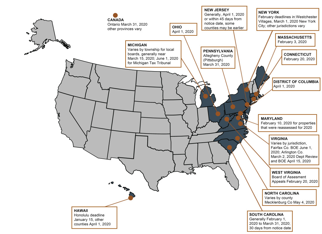 Taxpayers seeking to contest real property tax values established by assessing jurisdictions across the country often have a short window of opportunity to contest their new valuation. This time frame varies by state and by local jurisdiction, and in many cases begins to run upon the mailing of a new value notice. Below is a map of states/jurisdictions with upcoming appeal deadlines: