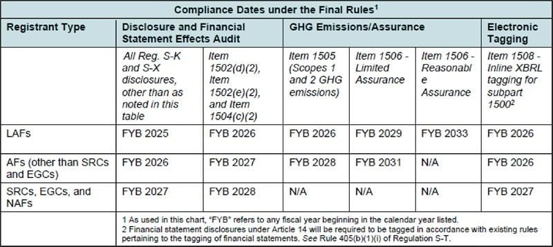 The final rules will be phased in, with the applicable compliance dates dependent upon the status of a company as an LAF, an AF, a nonaccelerated filer (NAF), a smaller reporting company (SRC), or an emerging growth company (EGC), and the content of the disclosure. Please see the following table for details.