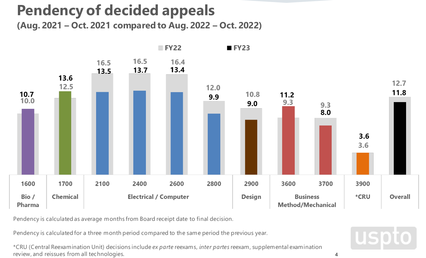 Looking more closely, we see there have been significant reductions in electrical and computer Tech Centers where appeals have generally had the longest pendency. In percentage terms, all major electrical and computer-related Tech Centers 2100, 2400, 2600, and 2800 reduced appeal pendency about 17%-18% in the periods compared in 2021 and 2022. Not surprisingly, Tech Center 3900, which handles reexaminations and other post-issuance procedures, has the shortest average pendency at less than 4 months. In contrast to the electrical arts, appeal pendency has increased about 7-9% for bio/pharma and chemical Tech Centers 1600 and 1700. Likewise Tech Center 3600, which infamously includes e-commerce and business methods art units, increased in pendency. Overall, the total pendency for an appeal before the PTAB across all technologies dropped about 7% and is now just under one year.