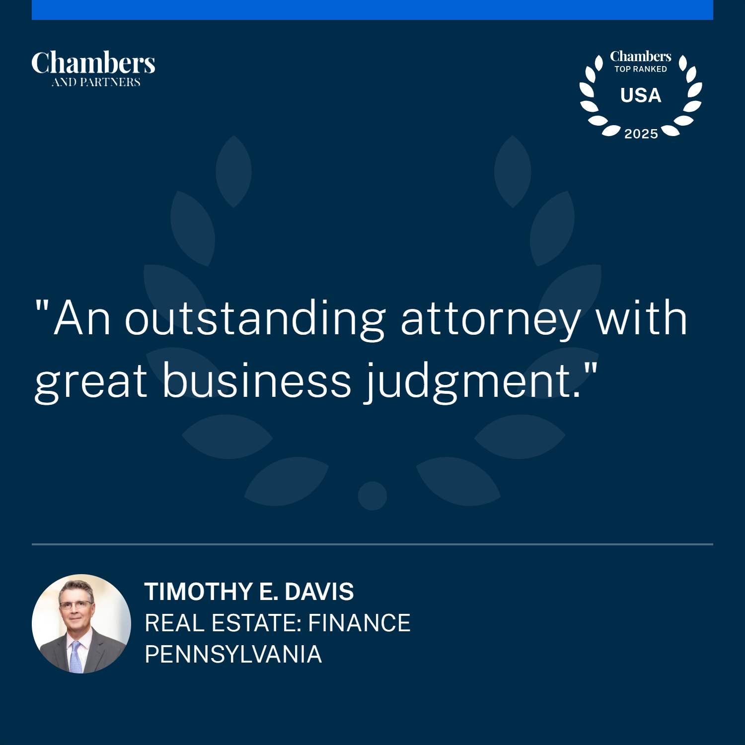 Since 2021, Tim has been recognized by Chambers USA (Tier 1) as a leading lawyer in Real Estate Finance in Pennsylvania. As part of the Chambers USA 2025 results, one reference commented, "Tim Davis, who leads the group, is always knowledgeable about individual deals. His team is knowledgeable and diligent. Tim’s client service, general level of service, level of sophistication and commercial vision are all very strong. I consider Tim to be a leader in the industry. He does an amazing job with his team." Another reviewer said, "I'm a big fan."