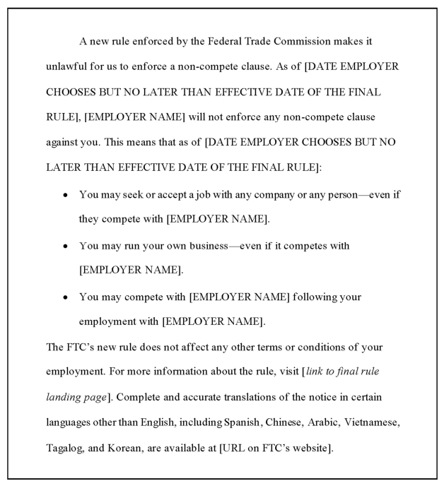 With respect to existing non-compete agreements, i.e., non-compete agreements entered into before the Final Rule’s effective date, the majority of such agreements are unenforceable after the Final Rule’s effective date. The Final Rule directs employers to provide workers with existing non-compete agreements notice that such agreement is no longer enforceable. Employers may provide notice by personal service, via mail to a last known address, email, or text message. The FTC has also provided a model notice form for employers to use.